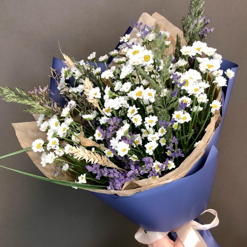 Стильный, нежный и трогательный. Свежий, как будто собран с утра в поле, чудесный букет из ромашек, лимониума и колосков пшеницы с сезонной зеленью порадует тех, кто устал от роз, хризантем и других «банальных букетов».
